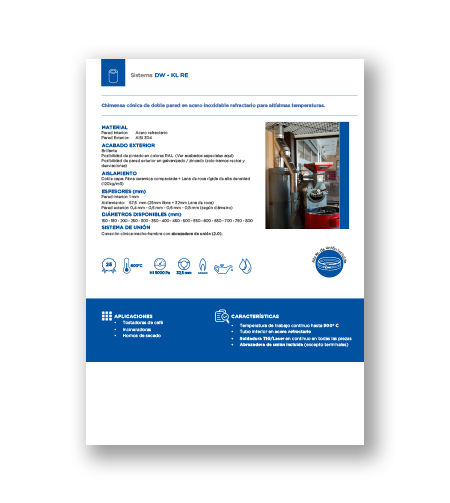DW RE combina la unión cónica del DWKL pero con el material del tubo interior en acero refractario capaz de soportar temperaturas altísimas de hasta 900° C sin deformaciones plásticas. Para garantizar máxima seguridad el aislante es de doble capa una primera capa de fibra cerámica de alta densidad de 25mm de espesor y una capa de lana mineral rígida de 32mm y 120 Kg/m³ de densidad y viene calorifugado con acero Aisi 304 como todos los sistemas estándar de Jeremias.